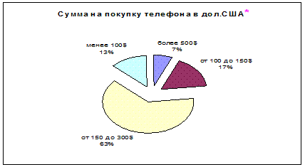 Однако, конечно же нельзя упускать из виду самый главный показатель при выборе сотового телефона – это его цена. Согласно Диаграмме 5. Телефоны в пределах 150–300 $ являются самыми востребованными. Они в принципе включают в себе приведенные выше основные характеристики современного телефона. Мобильник ценой выше 500 $ могут позволить себе только 7% опрошенных. Диаграмма 5 Распределение долей по ценовым сегментам