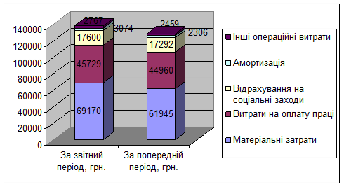 Витрати підприємства на здійснення своєї діяльності в цілому і по статтям за період що аналізується і за попередній представлені в таблиці 3.1 Як видно з таблиці 3.1 найбільша частина витрат ─ це матеріальні витрати, вони склали 61945 грн., проте вони значно зменшились у 2005 році порівняно з 2004. Це являє собою позитивний факт, оскільки при урахуванні збільшення доходів від реалізації товарів таке зменшення матеріальних витрат свідчити про покращення діяльності підприємства. Таблиця 3.1 Структура витрат підприємства „КФ „Ольга”
