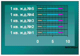 Рис. 1. График строительства объектов параллельным методом При параллельном методе продолжительность строительства одного дома (t) составляет 8,4 месяца. Периоды имеют следующую продолжительность по времени: – подготовительный период – 1,5 месяца; –подземная часть – 1,5 месяца; – возведение надземной части – 3,9 месяца; – отделочные работы и благоустройство – 1,5 месяца. Продолжительность строительства в целом по объекту оставляет 8,4 месяца. Если применить поточный метод организации работ, то продолжительность строительства одного дома (t) составит 2,8 месяца. Периоды будут иметь следующую продолжительность по времени: – подготовительный период – 0,5 месяца; – подземная часть – 0,5 месяца; – возведение надземной части – 1,3 месяца; – отделочные работы и благоустройство – 0,5 месяца. Общая продолжительность строительства составит 7,4 месяца (см. рис. 2).
