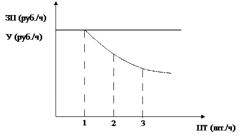 Рис.1 Повременная оплата труда Из рисунка видно, что при повременной оплате труда размер заработной платы (ЗП) не зависит от производительности труда (ПТ), но удельная заработная плата в расчете на каждую единицу продукции (У) при росте производительности труда будет уменьшатся. Из этого следует весьма важный вывод: в условиях применения повременной оплаты труда при низкой производительности труда предприятие имеет риск роста затрат. Повременная форма оплаты труда имеет две разновидности: простая повременная и повременно-премиальная. При простой повременной системе заработная плата работнику начисляется по присвоенной ему тарифной ставке или окладу за фактически отработанное время и рассчитывается по формуле: