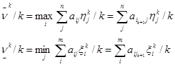 ( Теорема. В смешанном расширении матричной игры всегда существует ситуация равновесия. [17] §2. Итеративный метод Брауна-Робинсона (метод фиктивного разыгрывания) Часто в практических задачах нет необходимости находить точное решение матричной игры. Достаточно найти приближённое решение, которое даёт средний выигрыш, близкий к цене игры и приближённые оптимальные стратегии игроков. Ориентировочное значение цены игры может дать уже простой анализ матрицы выигрышей и определение нижней и верхней цен игры. Если они близки, то поисками точного решения заниматься не обязательно, так как достаточно выбрать чистые минимаксные стратегии. Если же они не близки, можно получить приемлемое для практики решение с помощью численных методов решения игр, из которых рассмотрим метод итераций. Пусть разыгрывается матричная игра ГА с матрицей А={aij } размера (m´n). Идея метода – многократное фиктивное разыгрывание игры с заданной матрицей. Одно разыгрывание игры будем называть партией, число которых неограниченно. В 1-ой партии оба игрока выбирают совершенно произвольные чистые стратегии. Пусть игрок 1 выбрал i-ю стратегию, а игрок 2 – j-ю стратегию. Во второй партии игрок 1 отвечает на ход игрока 2 той своей стратегией, которая даёт ему максимальный выигрыш. В свою очередь, игрок 2, отвечает на этот ход игрока 1 своей стратегией, которая обращает его проигрыш в минимум. Далее третья партия. С ростом числа шагов процесса смешанные стратегии, которые приписываются игрокам, приближаются к их оптимальным стратегиям. Этот процесс приближённого нахождения оптимальных стратегий игроков называется итеративным , а его шаги – итерациями. Итак, предположим, что за первые kразыгрываний игрок 1 использовал i-ю чистую стратегию Игрок 1 следит за действиями игрока 2 и с каждым своим ходом желает получить как можно больший выигрыш. Поэтому в ответ на применение игроком 2 своей смешанной стратегии y k , он будет использовать чистую стратегию ik +1 , которая обеспечит ему лучший результат при разыгрывании (k+1)-ой партии. Игрок 2 поступает аналогично. В худшем случае каждый из них может получить: