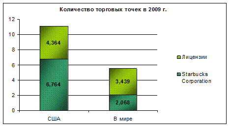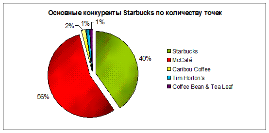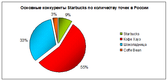 По объему продаж McDonlad’s(McCafé) также существенно опережает Stabucks. Только среди кофеен Starbucksявляется монополистом. Информация о желании американской Starbucks вывести сеть на российский рынок появилась давно. Однако, открытию кофеен в России помешала судебная тяжба с местным ООО «Старбакс», юристы которого требовали у американской компании $600 000 за право использования бренда на территории нашей страны. В ноябре 2005 г. российский суд встал на сторону Starbucks Corporation., после чего американцы активизировали переговоры с потенциальными партнерами.[25] Цель компании Starbuksв России запустить не менее 500 кофеен в ближайшие годы. В России Starbucksоткрыла 40 точек. Открытие остальных кофеен будет зависеть от результатов работы первых 40. У компании сложилась стратегия развития — расширяться постепенно, открывая по одной точке.Основными конкурентами Starbucks являются «Кофе Хауз» 200 и «Шоколадница» 180 , а также CostaCoffee, MoccoLocco, CoffeeRepublic и CoffeeBean 11.[26] В России McCafe и Starbucks почти не считаются конкурентами — во-первых, здесь они воспринимаются как действующие в разных нишах, во-вторых, присутствие Starbucks пока очень невелико.[27]