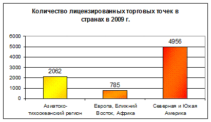 Лицензия не подразумевает никаких бизнес-ограничений, поэтому ее легко можно адаптировать ко многим продуктам. Многие страны, в которых размещается Starbucks, имеют свои национальные особенности. Применение стратегии лицензирование позволяет компании подстроиться к местным традициям и менталитету жителей различных страновых рынков. Стратегия лицензирования заключается в продаже зарубежным фирмам лицензий, предоставляющих право на использование технологий компании, либо на производство и распространение ее продукции. Компания хочет оградить себя от нашествия желающих открыть фирменную кофейню везде и всюду. В компании придерживаются принципа «качество лучше количества». Starbucks готов подождать с выходом на какой-нибудь рынок, пока не наладит работу в странах, где у нее уже есть заведения. Стратегия развития Starbucks– это глобальная стратегия. Компания используют единую модель конкуренции, общие технологии, знания и опыт во всех стран, где она действует. Также, Starbucksпредлагают стандартную продукцию, умеренно адаптированную при необходимости к местным условиям.[15] Большинство лицензиатов - видные ретейлеры со всесторонним знанием рынка и доступом. Starbucks получает лицензионные платежи и лицензионные сборы, продает кофе, чай и связанные продукты для перепродажи в имеющих лицензию местоположениях. Компания лицензирует права на производство и продажу фирменной продукции через несколько партнерств, как на национальном, так и на международном уровне. Значительные лицензированные соглашения включают в себя: • Партнерство «Североамериканское Кофе» - совместное предприятие с Pepsi-Cola Company, в которой Starbucks является 50%-ым инвестором акциий, производит и продает готовые к употреблению напитки, в том числе в бутылках - напиток «Frappuccino» и «Starbucks DoubleShot» в США и Канаде; • лицензионные соглашения на производство, сбыт и распределение «StarbucksDiscoveries», готового к потреблению охлажденного напитка и «Starbucks DoubleShot» эспрессо в Японии и Южной Корее; • лицензионное соглашение с партнерством, сформированным компаниями Unilever and Pepsi-Cola Company для производства, сбыта и распределения чая «Tazo», готового к потреблению в США; • лицензионное соглашение с Unilever для производства, сбыта и распределения мороженого Starbucks в США.[16]