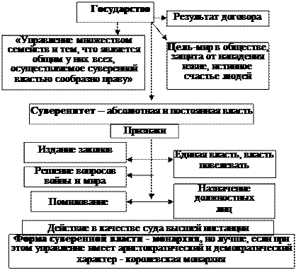 Во второй части Ла Боэси утверждает, что тиран опирается на приближенных, каждый из которых, в свою очередь, имеет в подчинении своих приближенных и т.д. «В конечном счете оказывается, что людей, которым тирания выгодна, почти столько же, сколько и тех, которым дорога свобода». И суть тирании, таким образом, в организованной иерархии связанных взаимной выгодой с тираном и между собой прислужников тирании, каждый из которых стремится «обеспечить себе долю в добыче и быть самим маленьким тиранчиком при большом тиране». Э. Ла Боэси выявил ряд типичных черт процедуры властвования, свойственной социально разнородному обществу, и дал им оценку с позиций народных масс. Все это - важный вклад в политико-юридическую теорию. 4. Жан Боден В конце XVI века во Франции шло ожесточенное религиозное противоборство между гугенотами и католиками. По сути, гражданская война создавала угрозу самому государству. В этой обстановке все больше укреплялась мысль, что единство и мир может обеспечить только сильная королевская власть, высказывалось мнение, что тирания лучше войны. С теоретическим обоснованием того, как король смог бы защитить общегосударственные интересы выступил выдающийся французский политический мыслитель Жан Боден (1530-1596 гг.). Его учение изложено в «Шести книгах о республике» (1576). Государство по Бодену «есть управление множеством семейств и тем, что является общим у них всех, осуществляемое суверенной властью сообразно праву». И, таким образом, ячейкой государства является семья, а возникает оно посредством договора, и высшая ее цель в том, чтобы, гарантируя мир внутри общества и защищая общность от нападения извне, заботиться об истинном счастье индивидов. Крупнейший вклад Бодена в политико-правовую теорию - в разработке проблемы суверенитета государства. «Суверенитет, есть абсолютная и постоянная власть, которую римляне называют величием (достоинством)... означающим высшую власть повелевать». Суверенная власть есть также власть единая. В том смысле, что ее прерогативы принадлежат только ей и она не может и не должна их делить с кем-либо, допускать каких-либо органов, которые стояли бы над нею или рядом. Боден выделяет пять отличительных признаков суверенитета - издание законов (но не создание права), решение вопросов войны и мира, назначение должностных лиц, действие в качестве суда высшей инстанции, помилование. Суверенная власть должна соблюдать ряд условий: блюсти божественные и естественные законы, не вмешиваться в дела семьи, соблюдать принцип веротерпимости, не взимать подати без согласия подданных. Должностные лица осуществляют свои действия только по поручению суверена. На вопрос где коренится, как проявляется суверенитет у Бодена ответ таков: «Суверенитет кроется в совокупности свободных и разумных существ, составляющих народ». «Эту верховную и постоянную власть над гражданами с правом жизни и смерти народ может передать одному из граждан без всяких ограничений так же, как это может сделать собственник, желающий кого-либо одарить». «Один из граждан» - это монарх. При этом, по Бодену, монарх предпочтительнее, т.к. там, где властвует один (во Вселенной - бог, на небе - солнце), там порядок. В монархии обеспечены компетентность (советуют многие) и энергичность власти (решает один). В демократическом государстве много закон