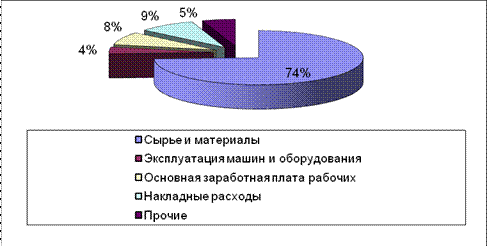 Рис. 7 Структура себестоимости кирпично-бетонной кладки наружных и внутренних стен На основании полученных данных можно сделать вывод, что в структуре себестоимости опять преобладают затраты на сырье и материалы (76%), что объясняется высокой материалоемкостью данного вида работ, примерно равны доли у основной заработной платы рабочих и накладных расходов – 10% и 9% соответственно, наименьшие доли у затрат на эксплуатацию машин и оборудование (3%) и прочих затрат (2%). 3.2. Классификация затратЗатраты - потребленные, потраченные или потерянные материальные, трудовые и финансовые ресурсы для извлечения прибыли в процессе хозяйственной деятельности предприятия. По взаимосвязи с загрузкой производственных мощностей затраты бывают: 1. переменные затраты 2. постоянные затраты. Переменные затраты — виды расходов, величина которых изменяется пропорционально изменению объемов продукции. Противопоставляются постоянным затратам, с которыми в сумме составляют общие затраты. Постоянные затраты - затраты предприятия, не зависящие от объема производства. Постоянными затратами являются затраты на содержание зданий, на содержание административного аппарата и т.д. Классификация затрат по экономическим элементам позволяет определить структуру себестоимости. Для этого исчисляют процентное соотношение удельного веса каждого вида затрат и всей себестоимости. Группировка затрат по калькуляционным статьям используется при составлении калькуляции (расчет себестоимости единицы продукции). Калькуляция позволяет определить, во что обходится предприятию единица каждого вида продукции, себестоимость отдельных видов работ и услуг. Необходимость данной классификации обусловлена тем, что расчет себестоимости по экономическим элементам затрат не позволяет учесть, где и в связи с чем произведены затраты, а также характер этих затрат в отдельных видах услуг. Определение же затрат по калькуляции как способ их группировки относительно конкретной единицы продукции позволяет отследить каждую составляющую себестоимости продукции (работ, услуг) на любом уровне. Классификация затрат на устройство скатных кровель представлена в таблице 9. Таблица 9 Классификация затрат на устройство скатных кровель