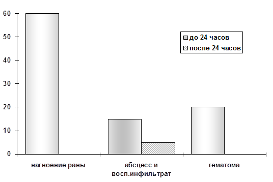 Вывод : Из таблицы следует , что среди послеоперационных осложнений наибольшую часть (60%) составляют нагноения раны. Распределение больных с определенным диагнозом по срокам поступления