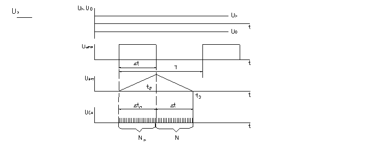 Мал.2. Схема ЦВ з час-імпульс перетворенням та часові діаграми напруг, які пояснюють принцип компенсації. В основу роботи ЦВ постійного струму з час-імпульсним перетворенням положений час-імпульсний метод перетворення постійного струму в прямо пропорційний інтервал часу з подальшим вимірюванням тривалості інтервалу. Похибки приладу залежать від лінійності та швидкості вимірювань компенсуючої напруги, стабільності генератора, генератора лічильних імпульсів, чутливості пристрою зрівняння, точності установки нуля або опорної напруги.