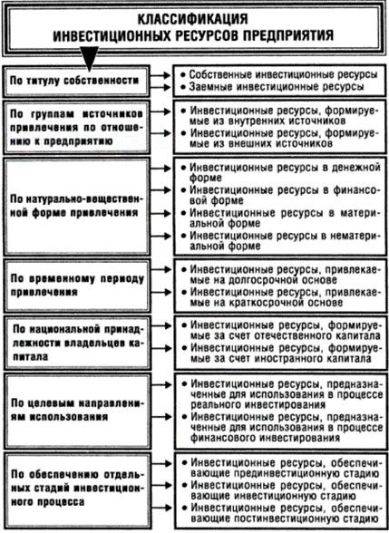 Рис. 1. Классификация инвестиционных ресурсов по основным признакам Методы финансирования инвестиционной деятельности предприятия. Под методом финансирования инвестиционного проекта понимают способ привлечения инвестиционных ресурсов в целях обеспечения финансовой реализуемости проекта. Основными методами финансирования инвестиционных проектов являются: - самофинансирование, т.е. осуществление инвестирования только за счет собственных средств; - акционирование, а также иные формы долевого финансирования; - кредитное финансирование (инвестиционные кредиты банков, выпуск облигаций); - лизинг; - бюджетное финансирование; - смешанное финансирование (на основе различных комбинаций этих способов); - проектное финансирование (метод финансирования, характеризующийся особым способом обеспечения возвратности вложений, в основе которого лежат исключительно или в основном денежные доходы, генерируемые инвестиционным проектом, а также оптимальным распределением всех связанных с проектом рисков между сторонами, участвующими в его реализации). Самофинансирование может быть использовано только для реализации небольших инвестиционных проектов. Капиталоемкие инвестиционные проекты, как правило, финансируются за счет не только внутренних, но и внешних источников. Сравнительная характеристика источников финансирования инвестиционных проектов