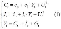 В этой системе три эндогенных переменных Идентификация модели состоит в нахождении в нахождении по исходным данным оценок коэффициентов модели c0 , с1 , i0 , i1. Приведем систему уравнение модели к структурному виду, в которой нет балансовых переменных. Подставим для этого балансовую переменную в остальные уравнения. Исключим из системы уравнений (1) балансовое уравнение