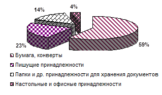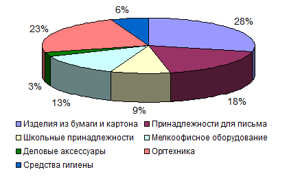 ВведениеРоссийский рынок канцтоваров растет быстрыми темпами, что связано с открытием новых компаний, и, соответственно, новых офисов. Кроме того, растет число так называемых домашних офисов, поэтому спрос на канцтовары не замедляется. Примерный годовой рост потребления канцтоваров – 15%. По сравнению с западными странами спрос на канцтовары остается низким. Ассортимент канцтоваров, который пользуется у нас широким спросом, составляет примерно 1–3 тысячи наименований. Западные компании в среднем имеют ассортимент в 5–7 тысяч позиций, а крупные дистрибьюторы канцелярских принадлежностей предлагают своим потребителям вместе с сопутствующим ассортиментом до 15 тысяч наименований продукции. В структуре импорта большую долю занимает продукция из стран Юго-Восточной Азии, в некоторых товарных группах доля азиатской продукции доходит до 30–60%. Однако лидеры рынка – европейские торговые марки. Их сильные стороны: низкая цена, широкий ассортимент и частая смена модельного ряда. Основной тенденцией на рынке канцтоваров является рост российского производства, импортозамещение групп товаров с максимальным оборотом (папки всех видов, пишущие принадлежности, лотки, корректура). По качеству российские канцтовары не уступают импортным, а цены при этом более низкие. На рынке очевидна тенденция роста спроса на продукцию с добавленной стоимостью – потребитель готов платить больше за качественный и функциональный товар, имеющий современный дизайн, а также за новинки. Большую часть рынка канцелярских товаров занимает сегмент товаров для офиса.К основным видам офисных товаров относятся: бумага формата А4 и А3 (белая и цветная); пишущие принадлежности; папки-регистраторы; изделия из мягкого пластика (различные папки, папки-уголки, папки-файлы); изделия из жесткого пластика (лотки, вертикальные накопители), клей и корректура. Структура рынка товаров для офиса представлена на рисунке 1.