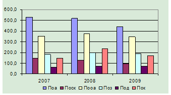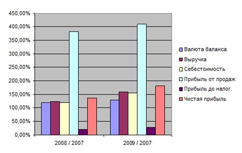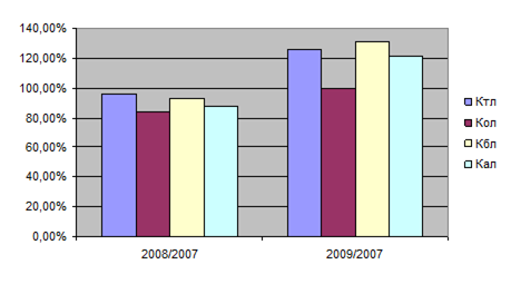 Выработка работников торговли в стоимостном выражении во многом зависит от изменения цен на товары. При повышении розничных цен растет товарооборот, а следовательно, и производительность труда торговых работников в стоимостном выражении. Для измерения влияния ценового фактора на выработку торговых работников необходимо ее рассчитать к товарообороту в действующих и сопоставимых ценах и сравнить полученные результаты. В связи с повышением розничных цен на товары среднегодовая выработка на одного торгово-оперативного работника возросла на 541,71 тыс. руб. (11,55%), а в сопоставимых ценах этот показатель возрос на всего на 79,21 тыс. руб. (1,69%). Поэтому в данном случае повышение производительности труда произошло только лишь за счет повышения уровня цен, что не совсем хорошо характеризует работу данного предприятия. Для оценки влияния изменения численности и производительности труда на рост товарооборота выразим товарооборот через взаимосвязь этих показателей по формуле (2.3.1): Т = Ч ×ПТ (2.3.1) Т1 = Т2 = Ч2008 × ПТ2008 = 12 × 4689,08 = 56269 тыс. руб Т3 = Ч2009 × ПТ2009 = 14 × 5230,79 = 73231 тыс. руб Влияние численности: Т1 – Т2 = 56269 – 56269 = 0 Влияние производительности: Т3 – Т2 = 73231 – 56269 = 16962 тыс. руб. В связи с увеличением производительности на 541,71 тыс. руб. товарооборот увеличился на 16962 тыс. руб. Совокупное влияние факторов: 16962 тыс. руб. Для проверки расчета сравним полученный результат с отклонением фактического товарооборота от планового (табл. 6). В нашем случае результат совпадает с данными, приведенными в таблице, значит, расчет выполнен правильно. 2.4 Анализ финансового состояния предприятияНа размер прибыли влияют следующие факторы: объем товарооборота, уровень валового дохода и уровень издержек обращения. Прибыль от реализации продукции (PQ ) представляет конечный результат деятельности предприятия в сфере производства и обращения. Она рассчитывается по формуле (2.4.1): [28] PQ =Q Р – S – K – Y (2.4.1) где PQ – прибыль от реализации; Q Р – выручка от реализации; S – себестоимость реализации; K – коммерческие расходы; Y – управленческие расходы; Величина прибыли от реализации продукции формируется под воздействием следующих факторов: объема и структуры реализации, ее полной себестоимости и оптовых цен. Между изменением объема реализации и размером полученной прибыли существует прямая пропорциональная зависимость при реализации рентабельной продукции и обратная зависимость при реализации убыточной. 1. Влияние объема реализации продукции определяется по формуле (2.4.2): DP1 = P0 × (К2 – 1) (2.4.2) где К2 = S1 : S0 = 69892: 52954 = 1,32 DP1 = 2300 × (1,32 – 1) = 736 тыс. руб. 2. Влияние изменения структуры и ассортимента реализованной продукции определяется по формуле (2.4.3): DP2 = P0 × (К1 – К2 ) (2.4.3) где К1 = QР1 : QР0 = 73231: 56269 = 1,3; К2 = S1 : S0 = 69892: 52954 = 1,32 DP2 = 2300× (1,3 – 1,32) = – 46 тыс. руб. Таким образом, в результате увеличения объема реализации прибыль увеличилась на 736 тыс. руб. В результате сдвигов в структуре и ассортименте прибыль уменьшилась на 46 тыс. руб. 3. Влияние изменения уровня затрат на 1 руб. реализованной продукции на прибыль определяется по формуле (2.4.4): DP3 = QР 1 ((S0 / QР 0) – (S1 / QР 1 )) (2.4.4) DP3 = 73231 × ((52954: 56269) – (69892: 73231)) = – 732 тыс. руб. В результате увеличение затрат на 1 руб. реализованной продукции прибыль уменьшилась на 732 тыс. руб. 4. Влияние изменения коммерческих расходов вычислим по формуле (2.4.5): DP4 = QР1 ((К0 / QР0) – (К1 / QР1 )) (2.4.5) DP4 = 73231 ×