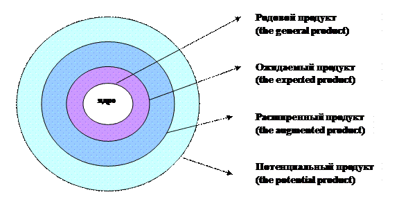 Ожидаемый продукт – репрезентует минимальные ожидания клиентов (включает то, что непременно сопутствует родовому продукту, а именно: цены, сроки и другие условия поставки, внешний вид помещения, персонала и др.) Расширенный продукт – включает то, что может отличать данный продукт от его рыночных аналогов в части дополнительных преимуществ, связанных с его приобретением и потреблением. По мере того, как клиенты привыкают к таким преимуществам, они перестают рассматриваться как дополнительные и становятся частью ожидаемого продукта. Потенциальный продукт – состоит из всего того, что потенциально достижимо и реализуемо в перспективе для привлечения и удержания клиентуры, в отличие от расширенного продукта, который фиксирует только то, что уже было сделано в этих целях. Углубляя идеи Т.Левитта, Филипп Котлер ввёл ещё один (пятый) уровень продукта в маркетинге и предложил в качестве сердцевины описываемой модели рассматривать не родовой продукт, а фундаментальную пользу (core benefit), которую принесет клиенту приобретение данного продукта (Котлер: останавливаясь в отеле, клиент приобретает не апартаменты, а покой и сон). Таким образом, Ф.Котлер закладывает основу для понимания того, что альтернативой в удовлетворении одной и той же потребности могут быть разнообразные маркетинговые продукты. Таким образом, возникает модель Левитта – Котлера. Вставка 2. Филипп Котлер в книге “Маркетинг менеджмент “ выделяет следующие 5 уровней товара[2] (фактически это популярная адаптация Концепции Левитта-Котлера). Каждый уровень увеличивает потребительскую ценность товара, все вместе они образуют иерархию потребительской ценности.