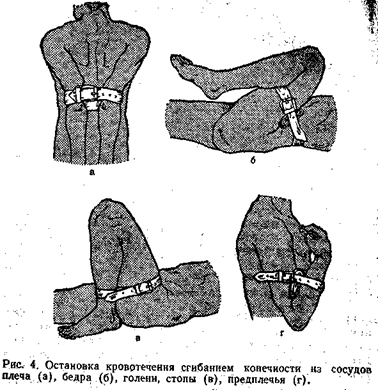Для временной остановки кровотечения из сосудов конечностей можно использовать метод максимального сгибания конечности в суставах (рис. 4). При кровотечении из сосудов плеча руку заводят за спину и фиксируют ее повязкой. Если кровоточат сосуды предплечья, руку сгибают в локтевом суставе. При кровотечении из ран голени или стопы ногу сгибают максимально в коленном суставе и, придав конечности такое положение, ее надежно прибинтовывают. Если кровотечение обильно, а источник его неизвестен, – спешите вызвать врача для спасения жизни больного. При кровотечении из носа пострадавшего нужно усадить так, чтобы голова находилась в вертикальном положении или была слегка отклонена назад; сжать нос на 2 – 3 мин; ввести в передний его отдел тампон, смоченный 3% раствором перекиси водорода; положить на область носа холодную примочку. Больному не рекомендуется дышать носом и сморкаться (рис. 5). При кровотечении после удаления зуба больной должен прижать кровоточащее место небольшим стерильным тампоном из ваты или марли и крепко сжать челюсти.