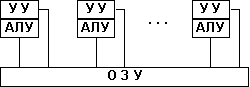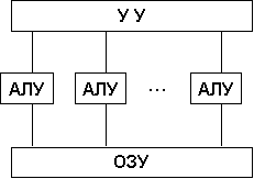 . Здесь несколько АЛУ работают под управлением одного УУ. Это означает, что множество данных может обрабатываться по одной программе — то есть по одному потоку команд. Высокое быстродействие такой архитектуры можно получить только на задачах, в которых одинаковые вычислительные операции выполняются одновременно на различных однотипных наборах данных. Структура таких компьютеров представлена на рисунке.