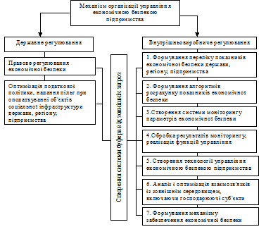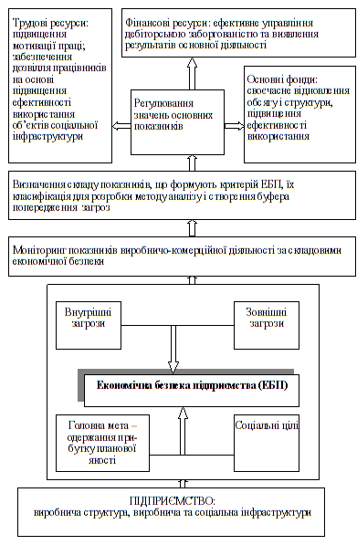 Рис. 3. Організація управління економічною безпекою підприємства Ураховуючи міжгалузеву сутність теорії організації інформаційної безпеки в умовах формування глобальної кіберцивілізації, в ній поєднуються методи пізнання традиційних фундаментальних наук: соціології та фізики, які концентруються у такій науці, як кібернетика. Це зумовлено безпосередньо предметом теорії: людино-машинними (соціо-технічними) системами, провідними яких є комп'ютеризовані інформаційні системи, в тому числі телекомунікаційні, та необхідність керування їх діяльності. Через наявність людського фактору як провідного теорія організації інформаційної безпеки як система знань має предметний гіперзв'язок з такими фундаментальними гуманітарними науками, як соціологія, соціальна психологія, правознавство тощо. У даному аспекті визначається також напрям теорії щодо оцінки, характеристики зловмисників, які посягають на безпеку інформаційної системи. У цьому аспекті теорія безпеки має зв'язок з кримінологією, в тому числі її складовими вченнями: віктимологією, теорією формування соціально-психологічного портрету зловмисника тощо[5, c. 63-64]. Інформаційна безпека в сучасному постіндустріальному світі, в якому основним товаром є інформація, в якому саме та чи інша інформація впливає на прийняття державою тактичних та стратегічних рішень, є основою національної безпеки. Для України, яка прагне до Європейського співтовариства, особливо важливим є приведення чинного законодавства до європейських стандартів, що передбачає прийняття нових законів, вдосконалення та доопрацювання чинних законів. Існує також необхідність у створенні координаційної комісії з питань нормативно-правового забезпечення інформаційної безпеки України, яка б стала акумулятором пропозицій різних органів державної влади та громадських організацій у справі вироблення інформаційної політики для України. Тому варто ще раз наголосити, що Україна потребує Закону «Про інформаційну безпеку», який би врегульовував суспільні відносини у сфері інформаційної безпеки, враховуючи те, що інформація організовується спонтанно, не через впорядкування з боку держави, те, що обмеження на поширення інформації, навіть для забезпечення національної безпеки, зумовлює сповільнення розвитку суспільства. Цей закон мав би давати визначення методів та засобів захисту життєво важливих інтересів особистості, суспільства, держави в інформаційній сфері, окреслив би засади для формування державної політики інформаційної безпеки, розвитку інформаційного простору країни. ВисновкиІнформаційна безпека - це суспільні відносини щодо створення і підтримання на належному (бажаному, можливому) рівні життєдіяльності відповідної інформаційної системи, у тому числі підприємництва. Підтримка інформаційної безпеки - це комплекс організаційних, правових та інженерно-технологічних заходів щодо збереження, охорони та захисту життєво важливих інтересів суб'єктів інформаційної діяльності, у тому числі підприємництва. Особливість безпеки інформаційної діяльності полягає у запобіганні, протидії та подоланні природних (стихійних), техногенних і соціогенних (антропогенних) загроз, здатних порушити (чи припинити) життєдіяльність конкретного суб'єкта (людини, соціальних спільнот, суспільства, держави, світ