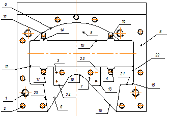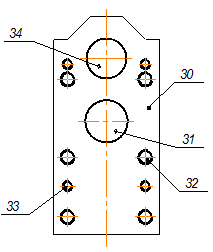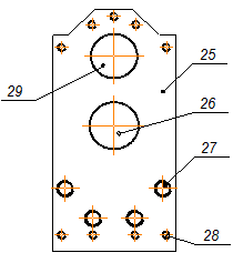 Рисунок 4.4 – Эскиз детали с обозначением поверхностей - Фрезеровать корпус по периметру начерно (элемент 8, сторона 1); - Сверлить 4 отверстия Ø 12,8 мм (элемент 1, сторона 1); - Зенковать фаски в отверстиях Ø 12,8 мм; - Нарезать резьбу М14´1,25 в отверстиях Ø 12,8 мм; - Фрезеровать корпус по периметру начисто (элемент 8, сторона 1); - Фрезеровать корпус по периметру начерно (элемент 8, сторона 3); - Фрезеровать по периметру начерно (элемент 30, сторона 4); - Фрезеровать поверхность начерно (элемент 42, сторона 6); - Фрезеровать по периметру начерно (элемент 25, сторона 2); - Фрезеровать поверхности начерно (элементы 35, 38, сторона 5); - Фрезеровать по контуру занижения (элементы 9, 10, 12, 13, 15, 18, 19, 20, 21, 22, 23, 24, сторона 3); - Фрезеровать плоскости занижений (элементы 5, 6, 7, сторона 3) начерно; - Фрезеровать плоскости занижений (элементы 5, 6, 7, сторона 3) начисто; - Фрезеровать плоскости 4 занижений (элемент 14, сторона 3); - Фрезеровать скосы начерно (элемент 41, сторона 6), а также фрезеровать поверхность (элементы 18, 19, сторона 3); - Расточить отверстие Ø 72 мм до Ø 85 мм (элемент 26, сторона 2), расточить отверстие Ø 72 мм до Ø 85 мм (элемент 31, сторона 4) начерно; - Расточить канавку Ø 91 мм в отверстии Ø 63 мм (сторона 2), расточить канавку Ø 91 мм в отверстии Ø 63 мм (сторона 4); - Расточить отверстие Ø 63 мм до Ø 81 мм (элемент 29, сторона 2), расточить отверстие Ø 63 мм до Ø 81 мм (элемент 34, сторона 4) начерно; - Фрезеровать скругления (элемент 11, сторона 3); - Фрезеровать скругления (элементы 12, 15, сторона 3), фрезеровать занижения (элемент 16, сторона 3), проточить 4 фаски в занижениях (элемент 17, сторона 3), фрезеровать плоскости 4 занижений (элемент 14, сторона 3); - Сверлить 4 отверстия Ø 12,8 мм (элемент 1, сторона 3); - Нарезать резьбу М14´1,25 в отверстиях Ø 12,8 мм; - Сверлить 4 отверстия Ø 22 мм (элемент 27, сторона 2), сверлить 6 отверстий Ø 22 мм (элемент 32, сторона 4); - Зенковать фаски в отверстиях Ø 12,8 мм; - Фрезеровать корпус по периметру начисто (элемент 8, сторона 3); - Фрезеровать поверхности начерно (элемент 40, сторона 6); - Фрезеровать по контуру занижения (элементы 9, 10, 12, 13, 15, 18, 19, 20, 21, 22, 23, 24, сторона 1) начерно; - Фрезеровать плоскости занижений (элементы 5, 6, 7, сторона 1) начерно; - Фрезеровать плоскости занижений (элементы 5, 6, 7, сторона 1) начисто; - Фрезеровать плоскости 4 занижений (элемент 14, сторона 1); - Фрезеровать поверхность (элементы 18, 19, сторона 3); - Фрезеровать скосы начисто (элемент 41, сторона 6); - Фрезеровать скругления (элементы 12, 15, сторона 3); - Фрезеровать скругления (элементы 12, 15, сторона 1), фрезеровать занижения (элемент 16, сторона 1), проточить 4 фаски в занижениях (элемент 17, сторона 1), фрезеровать плоскости 4 занижений (элемент 14, сторона 1); - Фрезеровать по контуру занижения (элементы 9, 10, 12, 13, 15, 18, 19, 20, 21, 22, 23, 24, сторона 1) начисто; - Сверлить 4 отверстия Ø 30 мм (элемент 36, сторона 5); - Фрезеровать скругления (элемент 12, сторона 1); - Сверлить 13 отверстий Ø 8,5 мм (элемент 2, сторона 1); - Сверлить 8 отверстий Ø 4,2 мм (элемент 4, сторона 1); - Сверлить 4 отверстия Ø 4 мм (элемент 3, сторона 1); - Зенковать фаски в отверстиях Ø 8,5 мм, Ø 4,2 мм; - Снять заусенцы по контуру детали; - Нарезать резьбу М10 – 7Н в отверстиях Ø 8,5 мм; - Нарезать резьбу М5 – 7Н в отверстиях Ø 4,2 мм; - Нарезать резьбу М33´3 – 6Н в отверстиях Ø 30 мм; - Расточить отверстие Ø 72 мм до Ø 85 мм (элемент 26, сторона 2), расточить отверстие Ø 72 мм до Ø 85 мм (элемент 31, сторона 4), расточить отверстие Ø 63 мм до Ø 81 мм (элемент 29, сторо
