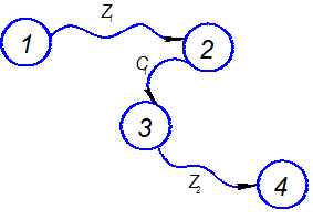 Рисунок 4.5 – Схема обработки детали Далее строим граф исходных структур (исходное «дерево») соответствующий исходной структуре, образованной связями между поверхностями в виде чертежных размеров и припусков. На графе исходных структур соединяющих поверхности 1 и 2 волнистыми ребрами, характеризующими величину припуска 1z2, поверхности 3 и 4 дополнительными ребрами, характеризующими величину припуска 3z4. А также проводим толстые ребра чертежного размера 2с1.