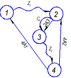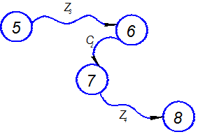 Рисунок 4.6 – Граф исходных структур - - "z" - Соответствует величине операционного припуска, а "c" – чертежному размеру. На основании разработанной схемы обработки строится граф произвольных структур. Построение производного древа начинается с поверхности заготовки, к которой на схеме обработки не подводится ни одной стрелки. На рисунке 4.7 такая поверхность обозначена цифрой «4». От этой поверхности проводим те ребра графа, которые касаются её. На конце этих ребер указываем стрелки и номера тех поверхностей, до которых указанные размеры проведены. Аналогичным образом достраиваем граф согласно схеме обработки.