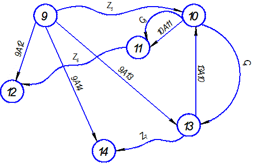 Рисунок 4.14 – Граф исходных структур - - "z" - Соответствует величине операционного припуска, а "c" – чертежному размеру. На основании разработанной схемы обработки строится граф произвольных структур. Построение производного древа начинается с поверхности заготовки, к которой на схеме обработки не подводится ни одной стрелки. На рисунке 4.15 такая поверхность обозначена цифрой «9». От этой поверхности проводим те ребра графа, которые касаются её. На конце этих ребер указываем стрелки и номера тех поверхностей, до которых указанные размеры проведены. Аналогичным образом достраиваем граф согласно схеме обработки.