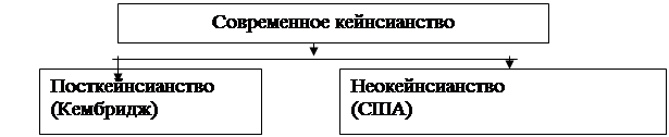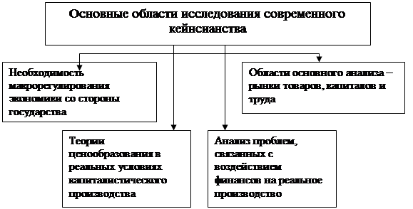Рис. 5 - Базовые направления современного кейнсианства Еще в 60-70-хгодах на арене экономической мысли появилось такое крупное направление, как посткейнсианство. Исторически оно сложилось из слияния двух потоков. С одной стороны, это было английское левое кейнсианство, центр которого находился в Кембридже, где долгое жила и работала лидер этого течения-Дж. Робинсон. С другой стороны, деятельность таких экономистов в США, как Ф. Клаудэр, А. Леонхуфвуд, Х. Мински и других. Кейнсианцев и их критиков разделяет вопрос о стабильности экономической системы. Сторонники современного кейнсианства исходят из того, что в капиталистическом хозяйстве существуют устойчивые причины, способные вызвать болезненные отклонения от стабильности роста и полного использования ресурсов, а поэтому необходимо вмешательство государства для их корректировки. Современное кейнсианство уже нельзя назвать макроэкономической теорией эффективного спроса. Акценты смещены на другие области анализа, связанные в первую очередь с функционированием рынков-капиталов, товаров и труда. Основное внимание уделяется анализу проблем, порождаемых активным воздействием финансовой сферы на ход реального производства. Следующей важнейшей проблемой, разработкой которой занято современное кейнсианство, является развитие теории ценообразования как новой основы макроэкономики. Цель этой теории – показать особенности ценообразования в реальных условиях современного капитализма, когда преобладание крупных фирм способных в определенных пределах регулировать цены и объемы производства, сочетается с господством сильных профсоюзов и коллективными договорами о заработной плате, когда в процессы ценообразования вмешивается государство, то есть в условиях существования регулируемых рынков товаров и рабочей силы. В итоге фирмы реагируют на изменение ситуации на рынках колебаниями объемов производства, результатом которых и являются длительные отклонения от состояния равновесия с неполным использованием производственных мощностей и рабочей силы.