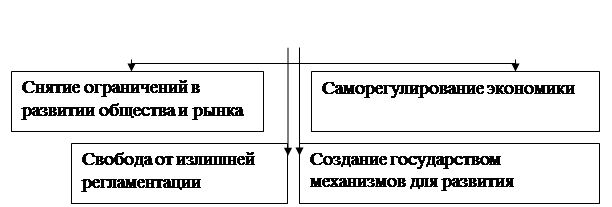 Рис. 6 - Основные области исследования современного кейнсианства Кризис кейнсианства последних десятилетий вызвал оживление неоклассического направления и способствовал возникновению новых тенденций в самом кейнсианстве. Различия между этими двумя ведущими направлениями современной экономической науки касаются главным образом исходных представлений о механизмах приспособления экономики к неравновесным ситуациям или “несовершенствам” рынка, о скорости этого приспособления и о том, кто, в конечном счете, способен быстрее, эффективнее и дешевле поправить дело – рынок или государство. Либеральное направление в экономической теории. Возникновение либерализма как течения западной экономической мысли относится к ХVIII веку. В его основе лежит политическая философия либерализма, кредо которого – знаменитый принцип “laisser faire” (“не мешайте действовать”) – можно раскрыть, как разрешить людям делать, что они хотят, предоставить им право быть самими собой в экономической деятельности и в вероисповедании, культуре, повседневной жизни и мысли.
