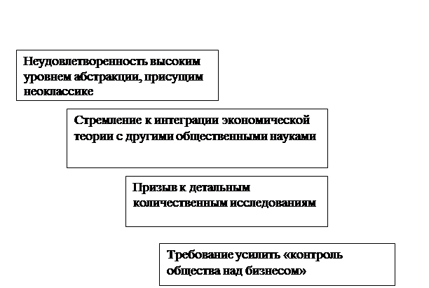 ![]() Рис. 7 - Особенности неолиберализма Неолиберализм – направление в экономической науке и практике хозяйственной деятельности, имеющее в основе принцип саморегулирования экономики, свободной от излишней регламентации. Современные представители экономического либерализма следуют двум, в известной мере традиционным, положениям: во-первых, они исходят из того, что рынок (как наиболее эффективная форма хозяйствования) создает наилучшие условия для экономического роста, и, во-вторых, они отстаивают приоритетное значение свободы участников экономической деятельности. Государство должно обеспечить условия для конкуренции и осуществить контроль там, где отсутствуют эти условия. Практически (и это в большинстве случаев вынуждены признавать неолибералы) государство теперь вмешивается в экономическую жизнь в широких масштабах и в различных формах. По сути, под названием неолибералов выступает не одна, а несколько школ. К неолиберализму принято относить чикагскую (М.Фридман), лондонскую (Ф.Хайек), фрайбургскую (В.Ойкен, Л.Эрхард) школы. Современных либералов объединяет общность методологии, а не концептуальные положения. Одни из них придерживаются правых (противники государства, проповедники абсолютной свободы), другие – левых (более гибкий и трезвый подход к участию государства в экономической деятельности) взглядов. Сторонники неолиберализма обычно выступают с критикой кейнсианских методов регулирования экономики. В США и в некоторых других западных странах современная неолиберальная политика опирается на ряд экономических подходов, получивших наибольшее признание. Это – монетаризм, который предполагает, что капиталистическая экономика имеет внутренние регуляторы и управление должно опираться преимущественно на денежно-кредитные инструменты; экономическая теория предложения, придающая важное значение экономическим стимулам; теория рациональных ожиданий: наличие информации позволяет предвидеть последствия экономических решений. В целом укреплению идей либерализма в значительной степени способствовал успех экономической политики, основанной на принципах экономической свободы, которую в разные периоды проводили правительства ведущих стран Запада. Наиболее показательным в этом отношении может служить опыт Германии, Великобритании и США. Международный валютный фонд также во многом строит свою деятельность, исходя из идей либерализма, в частности, монетаризма. Институционализм. Как течение экономической мысли (связанное с именами Веблена, Коммонса, Митчелла), институционализм сравнительно молод: его возникновение и оформление как научной школы относится к ХIX веку. Но уже к 30-м годам нашего столетия идеи институционализма получают широкое распространение в среде историков, экономистов и социологов. Первый период развития институционализма получил наименование так называемой старой негативной школы. Второй этап продолжался с 40-х по 60-е годы ХХ века; с начала 70-х годов открывается новый – и пока последний – этап в развитии институционализма. В институционализме выделяют три основные направления, обозначившиеся в конце XIX века: институционализм социально-психологический, социально- правовой и эмпирический (конъюнктурно-статистический).