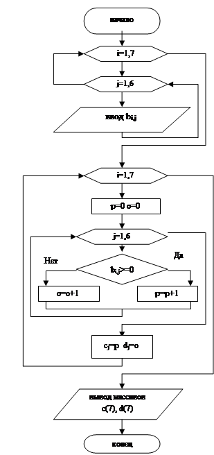 Определить количество положительных и отрицательных элементов каждой строки матрицы В(7,6) и записать результаты в новые массивы С и D. program massiv; var i,j,p,o:integer; b:array[1..7, 1..6] of integer; c,d:array[1..7]of integer; begin writeln(‘Введите массив b(7,6)’); for i:=1 to 7 do for j:=1 to 6 do readln(b[i,j]); for i:=1 to 7 do begin p:=0; o:=0; for j:=1 to 6 do if b[i,j] >=0 then p:=p+1 else o:=o+1; c[j]:=p; d[j]:=o; end; for i:=1 to 7 do writeln(‘c[‘,i,’]=’,c[i], ‘d[‘,i,’]=’,d[i]); end. ввод: