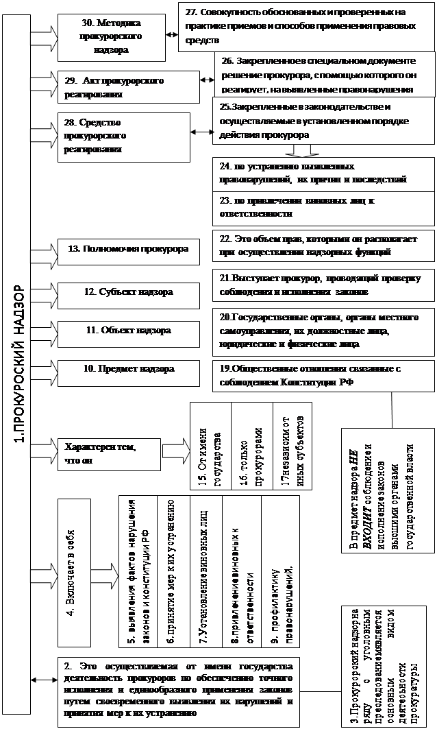 2. Функции и направления деятельности органов прокуратуры. 2.1 Основной правовой категорией, раскрывающей содержание, структуру и пределы организации деятельности органов прокуратуры, являются её функций. В Законе о прокуратуре нет Конкретной статьи, содержащей перечень функций органов прокуратуры. Они раскрываются в различных статьях Закона в зависимости от содержания. Например в статье 1 закреплено положение о том, что понятие прокуратуры раскрывается через её основную функцию - надзор за исполнением законов ( общий надзор). Но при этом делается акцент на то, что прокуратура РФ осуществляет и иные функции, установленные федеральными законами. В другой статье Закона установлено, что органы прокуратуры не могут осуществлять не возложенные на них в соответствии с законодательством функции. Пункт 2 ст. 1 Закона о прокуратуре содержит перечень основных функций прокуратуры. На основании вышесказанного функции прокуратуры можно определить как особый вид её деятельности, специально предназначенной для прокуратуры и выраженным в её задачах . Она характерезуется определённым предметом ведения и направлена на решение задач, поставленных перед прокуратурой, осуществляется при непосредственном применении полномочий и правовых средств, возложенных на прокуроров. Данные положения, определяющие функции деятельности прокуратуры, тесно связаны между собой и независимы друг от друга, изменение или уточнение которых влечёт за собой необходимые изменения в других частях функциональной характеристики. Наиболее яркой выраженной частью функции являются полномочия прокуратуры и средства их осуществления, придающие ей выраженность и завершённость и имеющие чёткую и полную правовую форму. Основной функцией прокуратуры , которая послужила основанием её создания, является надзор за исполнением законов . Исходя из правовых отношений, в которых осуществляется деятельность прокуратуры, надзорная функция подразделяется ещё на подфункции, которые хранят все части функции и наполняют их различным содержанием. Данные различия наиболее заметны в особенностях предмета надзора, формах его осуществления, содержании полномочий прокуроров, правовых последствиях, которые влекут за собой применяемые ими правовые средства, к числу таких подфункций относятся : - 1) надзор за исполнением законов федеральными министерствами и ведомствами, представительным (законодательными) и исполнительными органами субъектов РФ, органами местного самоуправления, органами военного управления, органами контроля, их должностными лицами, а также за соответствием законам издаваемых ими правовых актов; - 2) надзор за соблюдением прав и свобод человека и гражданина федеральными министерствами и ведомствами, представительными (законодательными) и исполнительными органами субъектов РФ, органами местного самоуправления, органами военного управления, органами контроля, их должностными лицами, а также органами управления и руководителями коммерческих и некоммерческих организаций; - 3) надзор за исполнением законов органами, осуществляющими оперативно-розыскную деятельность, дознание и предварительное следствие; - 4) надзор за исполнением законов администрациями органов и учреждений, исполняющих наказание и применяющих назначаемые судом меры принудительного