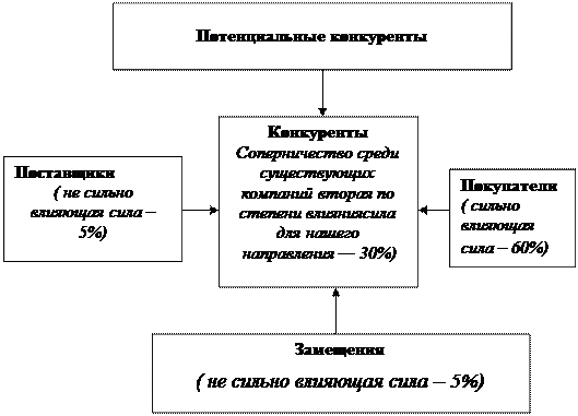 Рис. 3. Пять движущих сил конкуренции по М.Портеру На рисунке 3 представлены все 5 движущих сил М.Портера: конкуренция среди существующих фирм, товары-заменители, угроза появления на рынке новых компаний, поставщики и покупатели. Исходя из этого, можно распределить перечисленные выше силы по степени доминирования. Наиболее важной и влияющей силой отраслевой конкуренции для ЗАО «ППРЗ» является - рыночная власть потребителей (60% влияния). Следующей за ней по значимости идет - конкуренция среди существующих фирм (30% влияния). Остальные три силы, хотя имеют влияние на конкуренцию, в рассматриваемой отрасли, но по сравнению с перечисленными выше двумя не значительное (приблизительно 10%). Следовательно, основная стратегия маркетинга – борьба за потребителя. Анализ конкуренции. Из пяти основных конкурентных преимуществ, предложенных М. Портером, к ЗАО «ППРЗ» можно отнести стратегию дифференциации, нишера, концентрации на сегменте, немедленного реагирования на потребности рынка . Последовательно рассмотрим каждую из них. Стратегия дифференциации становится привлекательной, когда потребительские запросы и предпочтения становятся разнообразными и не могут более удовлетворяться стандартными пружинно-рессорными изделиями. Для того чтобы стратегия дифференциации была успешной, ЗАО «ППРЗ» периодически изучает запросы и поведение потребителей рынка для того, чтобы знать, какой продукции покупатели отдают предпочтение, что они думают о качестве продукции и за что готовы платить. В связи с этим, в ассортименте продукции ЗАО «ППРЗ»присутствуют пружины и рессоры, отличающиеся особыми качествами, и содержанием от продукции конкурентов. Именно за счет этого ЗАО «ППРЗ добивается конкурентного преимущества. Ибо все больше и больше покупателей становятся заинтересованными в предлагаемых ЗАО «ППРЗ» дифференцированных характеристиках выпускаемой продукции. Обычно неплохой идеей бывает добавление отличительных черт, не связанных с большими затратами, но направленных на более полное удовлетворение потребностей покупателей. Например, ЗАО «ППРЗ» следует осуществлять упаковку пружин и рессор, препятствующую порчи и потере потребительских свойств товара или осуществление бесплатной погрузки реализуемой продукции. При проведении стратегии дифференциации нужно внимательно следить за тем, чтобы затраты на единицу продукции не превышали значительно уровень конкурентов, так как это может привести к тому, что цены ЗАО «ППРЗ» возрастут настолько, что покупатели не захотят платить. За счет стратегии для обитателей ниш ЗАО «ППРЗ» удерживает свои позиции на рынке, предпринимая конкурентные ходы, направленные либо на атаку конкурентов, либо с целью защитить себя от угрозы, исходящей от конкурентов. В данной отрасли на региональном прикамском рынке есть общепризнанные лидеры, которые обладают большой долей рынка и обычно опережает другие компании по ценовым изменениям, выведению на рынок новых товаров, охвату зоны распределения товаров и затратам на стимулирование сбыта. ЗАО «ППРЗ» ищет возможности и средства для повышения совокупного спроса; стремится еще больше увеличить долю рынка, даже если объем рынка остается неизменным; постоянное снижение издержек должно оставаться сильной стороной; защита своей текущей доли рынка с помощью 