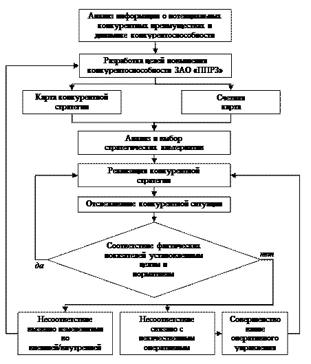 Рис. 5. Этапы разработки и реализации конкурентной стратегии предприятия При разработке конкурентной стратегии в качестве основных финансовых целей предприятия в конкурентной борьбе обозначены повышение его производительности, снижение затрат и рост объема продаж. Для достижения финансовых целей определены рыночные цели предприятия: увеличение доли рынка и обеспечение лучших условий поставок. Внутренними целями являются: снижение издержек производства; повышение качества производства на основе роста эффективности и качества закупок, повышения мотивации работников, внедрения прогрессивных технологий и инноваций; совершенствование планирования и управления финансами; повышение качества обслуживания клиентов. Таким образом, можно сделать вывод, что базовой конкурентной стратегией ЗАО «ППРЗ», как и для многих предприятий, по нашему мнению, должна стать стратегия повышения производительности и качества товара. Предложенная стратегия основывается, прежде всего, на снижении себестоимости продукции. Однако, с другой стороны, ориентируется на уникальность продукции, комплексное обслуживание конкретного сегмента рынка, побуждает предприятие искать неосвоенные рынки сбыта, где отсутствуют конкуренты, за счет внедрения инноваций, а также способствует опережению конкурентов на основе построения более мобильной системы управления, поскольку все перечисленные виды конкурентных преимуществ непосредственно влияют на объем продаж. Для систематизации сильных и слабых сторон, возможностей и угроз после внедрения новых стратегий был проведен SWOT-анализ. Данные приведены в таблице 3.1. Таблица 3.1 - Матрица SWOT-анализа