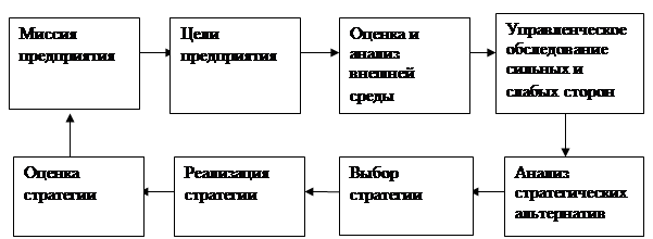 Рисунок 1 – Процесс стратегического планирования Миссия компании определяет её статус, декларирует принципы её функционирования, заявления, действительные намерения её руководителей. Это наиболее общая цель предприятия, выражающая причину её существования. Она выражает устремленность организации в будущее, показывая, на что будут направляться усилия и какие ценности будут при этом приоритетными. Вот примеры формулировки миссии. Инвестиционная компания. Мы готовы инвестировать капитал в любую область, работающую прибыльно и имеющую потенциал дальнейшего роста. Минизавод по переработке молока.