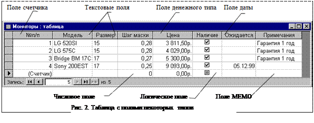 ![]() • Формат поля — определяет способ форматирования данных в ячейках, принадлежащих полю. • Маска ввода — определяет форму, в которой вводятся данные в поле (средство автоматизации ввода данных). • Подпись — определяет заголовок столбца таблицы для данного поля (если подпись не указана, то в качестве заголовка столбца используется свойство Имя поля). • Значение по умолчанию — то значение, которое вводится в ячейки поля автоматически (средство автоматизации ввода данных). • Условие на значение — ограничение, используемое для проверки правильности ввода данных (средство автоматизации ввода, которое используется, как правило, для данных, имеющих числовой тип, денежный тип или тип даты). • Сообщение об ошибке — текстовое сообщение, которое выдается автоматически при попытке ввода в поле ошибочных данных (проверка ошибочности выполняется автоматически, если задано свойство Условие на значение). • Обязательное поле — свойство, определяющее обязательность заполнения данного поля при наполнении базы; • Пустые строки — свойство, разрешающее ввод пустых строковых данных (от свойства Обязательное поле отличается тем, что относится не ко всем типам данных, а лишь к некоторым, например к текстовым). • Индексированное поле — если поле обладает этим свойством, все операции, связанные с поиском или сортировкой записей по значению, хранящемуся в данном поле, существенно ускоряются. Кроме того, для индексированных полей можно сделать так, что значения в записях будут проверяться по этому полю на наличие повторов, что позволяет автоматически исключить дублирование данных. Здесь мы должны обратить особое внимание читателя на то, что поскольку в разных полях могут содержаться данные разного типа, то и свойства у полей могут различаться в зависимости от типа данных. Так, например, список вышеуказанныхсвойств полей относится в основном к полям текстового типа. Поля других типов могут иметь или не иметь эти свойства, но могут добавлять к ним и свои. Например для данных, представляющих действительные числа, важным свойством является количество знаков после десятичной запятой. С другой стороны, для полей, используемых для хранения рисунков, звукозаписей, видеоклипов и других объектов OLE , большинство вышеуказанных свойств не имеют смысла. С основными типами данных мы уже знакомы. Так, например, при изучении электронных таблиц MicrosoftExcel мы видели, что они работают с тремя типами данных: текстами, числами и формулами. Таблицы баз данных, как правило, допускают работу с гораздо большим количеством разных типов данных. Так, например, базы данных MicrosoftAccess работают со следующими типами данных (рис. 13.2) .
