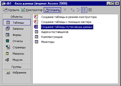 должно выступать ключевое поле, содержащее уникальные, неповторяющиеся значения. Значения на стороне «многие» могут повторяться. Рассмотрим таблицу Клиенты. Здесь поле Код клиента является ключевым. Это понятно, поскольку у каждого клиента должен быть свой уникальный код, идентифицирующий его однозначно. Если мы рассмотрим таблицу Заказы, то увидим, что в ней код клиента не может быть уникальным, поскольку каждый клиент мог сделать сколь угодно много заказов. На схеме данных эти поля соединены линией связи. С одной стороны эта линия маркирована знаком «1>, с другой стороны — значком «бесконечность». Это графический метод изображения связи «один ко многим». Ключевым полем в таблице заказов является Код заказа — он однозначно идентифицирует, кто, когда, что заказал и на какую сумму. Здесь же можно узнать, какой сотрудник принял заказ к исполнению. Поскольку один сотрудник может принять множество заказов, поле Код сотрудника в таблице заказов не является ни уникальным, ни ключевым, зато в таблице Сотрудники это поле уникально. Про подобные таблицы говорят, что они связаны реляционными отношениями. Соответственно, системы управления, способные работать со связанными таблицами, называют системами управления реляционными базами данных, а схему данных в технической литературе могут называть схемой реляционных отношений. 6. Разработкой схемы данных заканчивается «бумажный» этап работы над техническим предложением. Эту схему можно согласовать с заказчиком, после чего приступать к непосредственному созданию базы данных. Следует помнить, что по ходу разработки проекта заказчику непременно будут приходить в голову новые идеи. На всех этапах проектирования он стремится охватить единой системой все новые и новые подразделения и службы предприятия. Возможность гибкого исполнения его пожеланий во многом определяется квалификацией разработчика базы данных. Если схема данных составлена правильно, подключать к базе новые таблицы нетрудно. Если структура базы нерациональна, разработчик может испытать серьезные трудности и войти в противоречия с заказчиком. Противоречия исполнителя с заказчиком всегда свидетельствуют о недостаточной квалификации исполнителя. Именно поэтому этап предварительного проектирования базы данных следует считать основным. От его успеха зависит, насколько база данных станет удобной и будут ли с ней работать пользователи. Если отмечается, что пользователи базы «саботируют» ее эксплуатацию и предпочитают работать традиционными методами, это говорит не о низкой квалификации пользователей, а о недостаточной квалификации разработчика базы. На этом этапе завершается предварительное проектирование базы данных, и на следующем этапе начинается ее непосредственная разработка. С этого момента следует начать работу с системой управления базами данных. В нашем примере мы рассмотрим СУБД MicrosoftAccess 2000. 3. Работа с СУБД Access 2000 Ниже мы рассмотрим, как в программе MicrosoftAccess 2000 реализованы средства разработки основных объектов базы данных, и в упражнениях познакомимся с конкретными приемами работы. Однако прежде чем приступать к освоению системы, следует учесть ряд важных замечаний, связанных с особенностями ее автоматизации. СУБД MicrosoftAccess 2000 предоставляет несколько средств создания каждого из основных объект