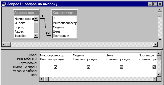 Таким образом, смысл создания реляционных связей между таблицами состоит, с одной стороны, в защите данных, а с другой стороны — в автоматизации внесения изменении сразу в несколько таблиц при изменениях в одной таблице. Если структура базы данных предприятия хорошо продумана, то исполнители, работающие с базой, должны навсегда забыть о том, что в базе есть таблицы, а еще лучше, если они об этом вообще ничего не знают. Таблицы — слишком ценные объекты базы, чтобы с ними имел дело кто-либо, кроме разработчика базы. Если исполнителю надо получить данные из базы, он должен использовать специальные объекты — запросы. Все необходимые запросы разработчик базы должен подготовить заранее. Если запрос подготовлен, надо открыть панель Запросы в окне База данных, выбрать его и открыть двойным щелчком на значке — откроется результирующая таблица, в которой исполнитель найдет то, что его интересует. В общем случае результирующая таблица может не соответствовать ни одной из базовых таблиц базы данных. Ее поля могут представлять набор из полей разных таблиц, а ее записи могут содержать отфильтрованные и отсортированные записи таблиц, на основе которых формировался запрос. Лишь в тех случаях, когда исполнитель не находит нужных данных в результирующей таблице, возникает необходимость готовить новый запрос — это задача разработчика базы. В учебных целях запросы лучше готовить вручную, с помощью Конструктора. Как и в случае с таблицами, для этого есть специальный значок в окне База данных. Он называется Создание запроса в режиме конструктора и открывает специальный бланк, называемый бланком, запроса по образцу. За этим длинным названием скрывается тот приятный факт, что, хотя запросы к таблицам баз данных пишутся на специальном языке программирования — SQJL , пользователям MicrosoftAccess изучать его не обязательно, а большинство операций можно выполнить щелчками кнопок мыши и приемом перетаскивания в бланке. Бланк запроса по образцу представлен на рис. Как видно, он состоит из двух областей. В верхней отображается структура таблиц, к которым запрос адресован, а нижняя область разбита на столбцы — по одному столбцу на каждое поле будущей результирующей таблицы. Идея формирования запроса по образцу чрезвычайно проста. С помощью контекстного меню на верхней половине бланка открывают те таблицы, к которым обращен запрос. Затем в них щелкают двойными щелчками на названиях тех полей, которые должны войти в результирующую таблицу. При этом автоматически заполняются столбцы в нижней части бланка. Сформировав структуру запроса, его закрывают, дают ему имя и в дальнейшем запускают двойным щелчком на значке в окне База данных. Порядок действий, рассмотренный выше, позволяет создать простейший запрос, называемый запросом на выборку. Он позволяет выбрать данные из полей таблиц, на основе которых запрос сформирован. Упорядочение записей в результирующей таблице. Если необходимо, чтобы данные, отобранные в результате работы запроса на выборку, были упорядочены по какому-либо полю, применяют сортировку. В нижней части бланка имеется специальная строка Сортировка. При щелчке на этой строке открывается кнопка раскрывающегося