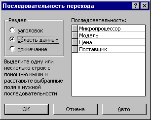 Для управления последовательностью перехода служит диалоговое окно Последовательность перехода. В нем представлен список элементов управления формы. Порядок элементов в списке соответствует текущему порядку перехода. Изменение порядка перехода выполняется перетаскиванием в два приема: • щелчком на кнопке маркера слева от названия выделяется элемент управления (кнопка мыши отпускается); • после повторного щелчка с перетаскиванием элемент перемещается на новое место. Закончив разработку макета формы, ее следует закрыть и сохранить под заданным именем. После открытия формы в окне База данных, с ней можно работать: просматривать или редактировать данные из базовой таблицы. Проверку последовательности перехода выполняют клавишей TAB. Работа со страницами доступа к данным Страницы (страницы доступа к данным) — новый объект баз данных, вошедший в последнюю версию Microsoft Access. Как и формы, этот объект служит для обеспечения доступа к данным, содержащимся в базе, но здесьречь идет об удаленном доступе, например о доступе через Интернет или через корпоративную сеть Intranet. С помощью страниц доступа к данным решается вопрос передачи данных из базы удаленному потребителю. Обычно базы данных имеют очень большие размеры, и напрямую передавать их через медленные каналы связи непрактично. В то же время, большинство современных Web-броузеров пока не имеют функций для работы с базами данных, размещенными на серверах. Таким образом, страницы доступа выполняют как бы посредническую функцию. Они имеют небольшой размер, содержат удобные элементы управления для навигации в базе данных, могут быть записаны в формате кода HTML , переданы по медленным каналам связи и воспроизведены в стандартном броузере. В связи с тем, что по формату они являются Web-документами, их нетрудно встроить в любой Web-документ, например, разместить на Web-странице. От прочих объектов базы данных страницы доступа отличаются тем, что имеют двойную природу. Прочие объекты базы являются внутренними. Так, например, мы не можем выделить ни таблицу, ни запрос, ни форму в виде самостоятельного файла. Эти объекты размещаются где-то внутри файла базы данных, но операционная система компьютера работать с ними не может, поскольку это не файлы. С ними работает лишь сама система управления базой данных. Страница же представлена двумя объектами — внутренним объектом базы (его можно редактировать) и внешним объектом — файлом в формате HTML Запись этого файла происходит при сохранении спроектированной страницы доступа. Создание страницы доступа к данным . Для страниц доступа, как и для форм, важную роль играет внешний вид, поэтому создавать их удобно с помощью мастера. Мастер страниц запускается щелчком на значке Создание страницы доступа к данным с помощью мастера. 1. На первом этапе работы Мастера форм выбирают таблицы (или запросы), в их составе — поля, к которым должна обеспечить доступ страница. 2. Второй этап работы мастера предназначен для управления группировкой данных. Эта возможность предусмотрена для доступа к базам, содержащим большие объемы данных. Если значения в некотором поле часто повторяются, имеет смысл объединить соответствующие им записи в группу. Так, например, для страницы, обеспечивающей доступ к таблице Комплектующие, в отдельные группы могут быть собраны записи, о
