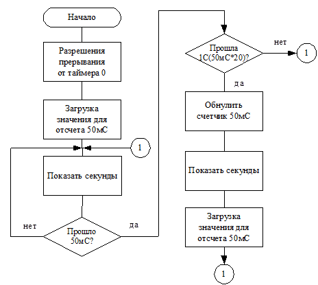 4. Секундомір. Програма використає апаратні засоби відліку тимчасових інтервалів - таймер 0 (200Bh). Час виводиться на ССИ за допомогою стандартної процедури 0940 (для цього потрібне значення потрібно помістити в регістр R0). Програма виконується в зацикленому стані. Алгоритм роботи програми: