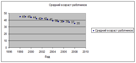 Таким образом, можно отметить, что в подразделении существует явное неравенство мужчин и женщин. Рассмотрим, с чем связано резкое преобладание мужчин в компании. Большая часть мужчин занята работой на основном производстве – 90% против 10% женщин и такое же соотношение в подразделении. Это работа, требующая физической силы и выносливости, поэтому данное соотношение продиктовано скорее потребностями компании в рабочих кадрах, чем гендерной дискриминацией. Средний возраст работников – 35 лет. Необходимо отметить, что он уменьшался в течение последних десяти лет. Налицо явное омоложение кадров компании.