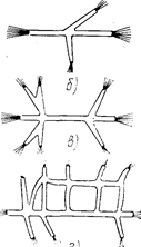 Рис. 9. Способы вязки жгута Вязку осуществляют в одну, две нитки и более с натяжением вручную или с помощью приспособлений. Для снижения трудоемкости процесс вязки жгутов механизируют, используя пневматические пистолеты [4], а иногда и автоматизируют, осуществляя вязку жгутов на специальных полуавтоматических станках. Последовательность вязки жгутов показана на рис. 10, а—д. Для защиты от механических повреждений жгут по всей длине или на определенном участке обматывают изоляционной лентой. Если он состоит из проводов с хлопчатобумажной или' шелковой изоляцией, то для защиты от влаги жгут пропитывают водоотталкивающим составом. Для защиты от воздействия высокой температуры или агрессивной среды жгуты помещают в трубчатые, ленточные, полосовые или плетеные оболочки. Их надевают вручную или на станке после снятия жгута с шаблона. Таким образом, вязка жгутов является не менее трудоемкой операцией, чем раскладка и маркировка проводов. Кроме применения различных приспособлений для механизации операций изготовления жгута целесообразно в условиях серийного производства использовать конвейерные линии. В этом случае технологический процесс разбивают на ряд мелких операций. На каждом рабочем месте полностью осуществляют раскладку проводов одного сечения и марки. При определении, такта работы конвейера ориентируются на операцию раскладки исходя из того, что операцию вязки легче подчинить выбранному ритму. Например, на вязку 16—24 петель затрачивается 3—5 мин. Чаще всего такт работы составляет 5 или 7,5 мин.