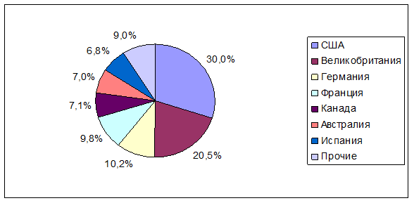 Рис.1. Примерное распределение международного рынка образовательных услуг (по данным журнала «Эксперт»). По числу иностранных учащихся первое место в мире занимают США (28 %) – устойчивый лидер, контролирующий почти треть мирового финансового образовательного оборота. В 2001 году в США обучались 548 тысяч иностранных студентов. На втором месте по объемам образовательных продаж — Великобритания (14%), которая за 1990-е годы почти утроила прием иностранных студентов и где численность последних составляет сейчас около четверти миллиона. Анализ информационных ресурсов Интернет показал, что эффективность функционирования системы высшей школы в США и Великобритании во многом может быть объяснена рыночной моделью образования, главными особенностями которой являются: - университет функционирует как предпринимательская организация, предоставляющая образовательные услуги, и в значительной степени ориентируется на международный рынок; - качество и востребованность образовательных услуг обеспечивается кафедрами университетов; - бюджет университета ориентирован на удовлетворение спроса на образовательные услуги и поощряет преподавателей кафедр на инновационную деятельность; - качество образовательных услуг оценивается независимыми от государства организациями и потребителям доступна достоверная информация о рейтинге этих услуг. На третьем месте Германия (12 %), на четвертом Франция (8 %), и почти такое же количество иностранных студентов в Австралии (7 %). В группу лидеров международных образовательных услуг входят также Канада, куда в 2001 году по студенческой визе приехало 100 тысяч иностранных граждан, не считая еще 100 тысяч человек прибывших в Канаду на краткосрочные языковые курсы, и Испания, которой, удалось за пять последних лет вдвое увеличить число иностранных студентов - с 62 до 124 тысяч человек. Россия занимает восьмое место в мире по количеству обучающихся иностранных студентов (если относить к ним и выходцев из стран СНГ) - 5 %. Далее идет Япония - 4 %, Бельгия, Австрия и Италия (по 2 %). Таким образом, в пяти странах: США, Великобритании, Гер-мании, Франции, Австралии обучается - 70 % от общего числа иностранных студентов. Значительное число иностранных студентов в этих странах - результат активной деятельности самих вузов, целенаправленной государственной экономической, политической, информационной поддержки. Также в Таблице 2 представлены обобщенные данные рейтингов популярности ВУЗов, согласно рейтингу «Таймс» и Шанхайскому рейтингу. Таблица 2 – Рейтинги ВУЗов