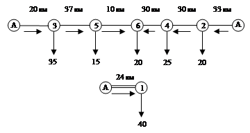 Рисунок 2.1 - Варианты схем проектируемого района 3. Предварительное распределение мощностей 3.1 Предварительное распределение мощностей для варианта 1 «Разрежем» схему первого варианта по источникам питания. Получим две независимых схемы (рисунок 3.1). Обе схемы представляет собой линии с двухсторонним питанием. Найдём потоки активной мощности в них: