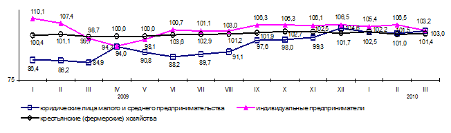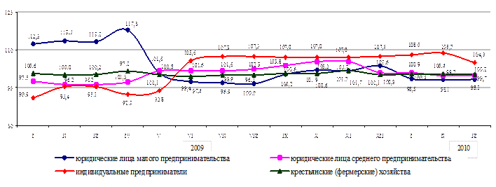 В общем количестве субъектов МСП доля индивидуальных предпринимателей составила – 64,6%, крестьянских (фермерских) хозяйств – 25,6%, юридических лиц малого предпринимательства – 9,4%, юридических лиц среднего предпринимательства – 0,4%. Количество активных субъектов МСП на 1 апреля 2010 года единиц