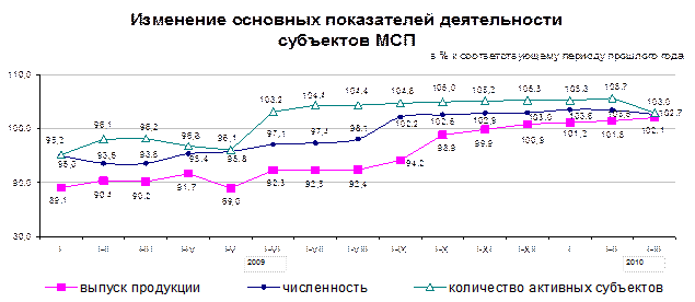 Мы видим, что в январе-марте 2010 года по сравнению с январем-мартом предыдущего года, выпуск продукции (в сопоставимых ценах) увеличился на 2,1%. При этом, количество активных субъектов МСП увеличилось на 3%, численность занятых - на 2,7%. Изменение количества активных субъектов МСП в % к соответствующей дате предыдущего года
