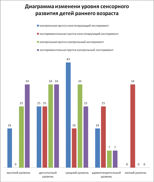 ВЫВОД Для подтверждения гипотезы нами был проведен психолого-педагогический эксперимент, который включал констатирующий, формирующий и контрольный этап. Экспериментальное исследование было проведено в ДУЗ №60 г.Симферополя с детьми раннего дошкольного возраста. Время проведения с 1 января по 15 марта 2010 года. Для проведения эксперимента мы выбрали две первых младших группы – экспериментальная и контрольная. Экспериментальная группа состояла из 12 человек – 5 мальчиков и 7 девочек, возраст детей о 2,2 до 2,11 лет. Контрольная группа также состояла из 12 человек – 6 мальчиков и 6 девочек, возраст – от 2,5 до 2,10 лет В ходе констатирующего этапа эксперимента мы выявили уровни сенсорного развития детей раннего возраста с помощью диагностики, описанную Канонко О.Л Исследование показало, что в экспериментальной группе детей с высоким уровнем сенсорного развития не наблюдается; у 25 % детей достаточный уровень сенсорного развития; у 16 % детей средний уровень, у 25 % удовлетворительный и у 34 % детей низкий уровень сенсорного развития. В контрольной группе у 16 % детей высокий уровень сенсорного развития; у 25 % детей достаточный уровень сенсорного развития; у 43 % детей средний уровень, у 16 % удовлетворительный и детей низким уровнем сенсорного развития не наблюдается. На основе полученных данных мы провели формирующую работу по сенсорному развитию у детей раннего возраста. В коррекционной работе мы использовали ряд игр и игровых упражнений. В ходе контрольного этапа эксперимента мы проверяли эффективность проведенной работы. Мы определяли изменение уровня сенсорного развития детей раннего возраста. Выявили, что экспериментальной группе при диагностики уровня сенсорного развития мы выявили такие данные: у 34 % детей высокий уровень сенсорного развития; у 34 % детей достаточный уровень сенсорного развития; у 25 % детей средний уровень, у 7 % удовлетворительный и детей низким уровнем сенсорного развития не наблюдается. В контрольной группе у 25 % детей высокий уровень сенсорного развития; у 34 % детей достаточный уровень сенсорного развития; у 34 % детей средний уровень, у 7 % удовлетворительный и детей низким уровнем сенсорного развития не наблюдается. Таким образом, результаты исследования показали, что проведенная работа, способствовала сенсорному развитию у детей раннего возраста экспериментальной группы.