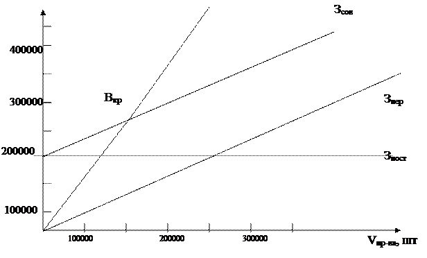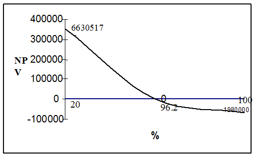IRR = r1 + (NPV1 /NPV-NPV2 ) * (r2 – r1 )) IRR = 20%+(239933,63 /(239933,63 -191928,94) * (25% – 20%)) = 44,95 % IRR > r1 – проект приемлем Расчет точки безубыточности. Рис.2 График зависимости интегрального экономического эффекта от ставки дисконтирования. 1)