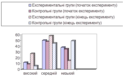 Рис.2. Динаміка зміни рівнів сформованості готовності старшокласників до свідомого професійного вибору медичної спеціальності Аналіз результатів педагогічного експерименту показав, що мотивація на опанування медичних професій у старшокласників експериментальних груп зросла на 37%, у контрольних – на 6%; показники сформованості моральних особистісних якостей, етичних, деонтологічних та інтелектуальних цінностей зросли: в експериментальних групах на 51%, у контрольних на 10%; рівень знань у галузі основ загального і спеціального догляду за хворими зріс у експериментальних групах на 70%, у контрольних становить 5,5%; рівень оволодіння інформаційними відомостями з медицини у експериментальних групах зріс на 48%, у контрольних – на 4%; сформованість системи початкових професійно важливих умінь та навичок у старшокласників експериментальних груп зросла на 54%, у контрольних показники відсутні; рівень опанування різноманітними технологіями навчання, які використовуються у вищих медичних навчальних закладах, зріс в експериментальних групах на 49%, у контрольних на 3,4%. Участь старшокласників у позанавчальних формах профорієнтаційної роботи зросла в експериментальних групах на 48%, у контрольних – на 10%. Взаємодія колективу експериментального медичного ліцею з соціальними інститутами (сім'я, лікувальні заклади, театри, музеї тощо) у роботі з професійної орієнтації старшокласників на медичні спеціальності зросла на 40%, у контрольних групах – на 2-5%; використання бази (аудиторій, лабораторій) для позакласних форм роботи (клубів, гуртків) в експериментальному медичному ліцеї зросло на 40%, у контрольних групах – залишилося без змін. Результати експериментально-дослідної роботи узагальнено у 9 таблицях та 12 рисунках. Результати проведеного дослідження дають підстави вважати, що вихідна методологія була правильною, мети досягнуто, поставлені завдання розв’язані, що дало можливість сформулювати такі висновки : 1. Аналіз наукової літератури свідчить, що проблеми професійної орієнтації старшокласників на медичні спеціальності розглядаються з урахуванням освітніх потреб, нахилів і здібностей молодої людини, створення умов для навчання відповідно до її професійного самовизначення. Виявлено, що метою професійної орієнтації є формування індивідуальної готовності до майбутнього фаху згідно з власним потенціалом особистості та її можливостями, що зумовлює рівний доступ молодої людини до профільного навчання в умовах допрофесійної підготовки, а також здатності до неперервної освіти впродовж усього життя. У дисертації зміст поняття „професійна орієнтація на медичні спеціальності ” розглядається як спеціально організований цілеспрямований педагогічний вплив на старшокласників медичного ліцею на основі врахування їхніх особистісних характеристик з метою формування свідомого професійного самовизначення на медичні спеціальності. Вивчення сучасного стану професійної орієнтації старшокласників на медичні спеціальності підтвердило актуальність та доцільність дослідження. 2. Розроблена, обґрунтована та експериментально перевірена модель організації професійної орієнтації старшокласників на медичні спеціальності у процесі їхньої допрофесійної підготовки в медичному ліцеї спрямована на формування свідомого професійного 