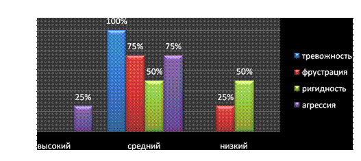 Интерпретация: У испытуемых тревожность средняя, допустимого уровня. Фрустрация как средняя у 75%, т.е. фрустрация имеет место, так и низкая, т.е. у 20% фрустрации нет. Агрессивность у 25% высокая, ярко выраженная, у данных испытуемых есть трудности при общении и работе с людьми, а также у 75% агрессивность средняя. Ригидность у 75% средняя, есть небольшие трудности при переключаемости, а у 25% ригидности нет, легкая переключаемость. «Диагностика состояний стресса».