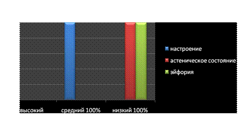Интерпретация: У 100% испытуемых наблюдается хорошее настроение, у 100% наблюдается низкое астеническое состояние и низкое состояние эйфории. «Есть ли у Вас невроз №6».