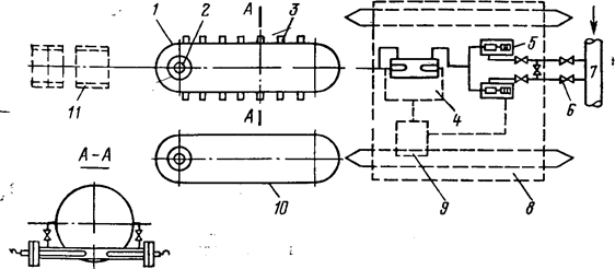 Рис. 3 . Блочная дозировочная установка для подготовки раствора ПАВ: 1— электрошкаф: 2—корпус будки; 3—верхний бак-смеситель; 4—тележка; 5—нижние баки; 6— ролики; 7—электронагреватели; 8— центробежный насос; 9— стенка будки с термоизолирующим материалом; 10 — платформа саней Технология закачки слабоконцентрированных растворов ПАВ связана с многолетними сроками дозирования, требует специального обслуживания, что в условиях автоматического режима работы КНС не всегда удобно. В этом отношении импульсная (разовая) закачка малообъемной оторочки большой концентрации имеет несомненные технологические преимущества, так как реализуется в течение нескольких дней. В Татарии, например, перспективной считается закачка 5%-ных растворов ПАВ типа ОП-10. Принципиально это можно осуществить при помощи тех же технических средств. Еще более концентрированные растворы можно закачивать в скважину по схеме, показанной на рис. 7. По данной схеме синтез и формирование концентрированного раствора ПАВ осуществляется непосредственно в полости скважины и призабойной зоне пласта. Алкилированная серная кислота закачивается в скважину из автоцистерн через приемо-раздаточную гребенку, линию высокого давления и блок манифольдов агрегатами типа 4АН-700. Пенореагент подается в скважину также при помощи агрегатов типа 4АН-700 через приемо-раздаточную гребенку, линию высокого давления и блок манифольдов, в котором происходит контактирование и смешение пенореагента с алкилированной серной кислотой. Линии высокого давления оснащаются обратными клапанами, а блок манифольдов—манометром и предохранительным клапаном. Приемные и нагнетательные линии подвергаются опрессовке под давлением, превышающим рабочее давление нагнетания; линии высокого давления, блок манифольдов и обвязка устья скважины спрессовываются с использованием одной пары агрегатов 4АН-700, а приемные линии — при помощи центробежных насосов.