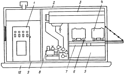 Рис. 2 . Схема дозаторной установки БДУ-З: 1— насос; 2 — дозаторный насос; 3 — манометр; 4 — электровагреватели; 5 — змеевик; 6—бак; 7—ролики; 8— тележка; 9— бак-смеситель; 10— вентили Основной элемент технологической схемы закачки раствора ПАВ—дозировочная установка (рис. 5), предназначенная для разогрева, слива и приготовления водных растворов высоковязких ПАВ, поступающих на КНС, скважину или другой промысловый объект. Для разогрева реагента (рис. 6) металлические бочки вместе с химреагентом пакуются в камеру установки и нагреваются при помощи блока электронагревателей, что обеспечивает слив разжиженного реагента из предварительно открытых сливных отверстий в нижние баки. Смешение реагента с водой проводится в верхнем баке-смесителе, предварительно заполненном необходимым объемом воды и ПАВ, путем циркуляции в замкнутой цепи «насос, вентиль, смеситель, вентили, насос». Подготовленный таким образом разбавленный до 40—80% раствор ПАВ подается на прием дозирующего насоса и далее в линию закачки с подачей, обеспечивающей получейие необходимой концентрации реагента в нагнетаемой в пласт воде. Дозировка может осуществляться как на прием основных насосов КНС, так и на выкид. В первом случае применяются дозировочные насосы на давление 5— б МПа, во втором—на давление до 20 МПа и более. Описываемая дозаторная установка позволяет подавать ПАВ без предварительного разбавления, а также создавать необходимый запас раствора ПАВ в резервных емкостях. Попеременное подключение емкостей обеспечивает непрерывность процесса.