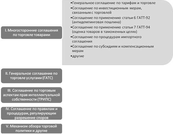 Схема 1. Основные многосторонние соглашения ВТО Структура Всемирной торговой организации: Высшим органом ВТО является Министерская конференция, объединяющая представителей всех участников ВТО. Сессии собираются по крайне мере каждые два года. Между сессиями по необходимости созывается Генеральный совет (ГС), состоящий также из представителей стран-членов ВТО. Кроме того, Генеральный совет администрирует деятельность по урегулированию споров и Орган по обзору торговой политики. Под руководством ГС работают Совет по торговле товарами, Совет по торговле услугами и Совет по торговым аспектам прав на интеллектуальную собственность. Министерская конференция создает Комитет по торговле и развитию, Комитет по ограничениям в целях обеспечении равновесия платежного баланса, Комитет по бюджету, финансам и администрации, Комитет по торговле и окружающей среде, а также комитет по региональным торговым соглашениям. Членство в советах и комитетах открыто для всех участников ВТО. Министерская конференция назначает Генерального директора ВТО. Гендиректор назначает сотрудников Секретариата ВТО и определяет их обязанности и условия прохождения службы в соответствии с положениями, принятыми Министерской конференцией. В ВТО практикуется принятие решений консенсусом. При его отсутствии решение принимается большинством голосов, если другого не предусмотрено. Толкование положений соглашений по товарам, услугам, интеллектуальной собственности, освобождение от принятых обязательств (вейвер) принимаются ¾ голосов. Поправки, не затрагивающие прав и обязательств участников, а также принятие новых членов требуют 2/3 голосов. Полноправными участниками ВТО являются 150 стран. Еще около 60 международных организаций имеют статус наблюдателя при ВТО.